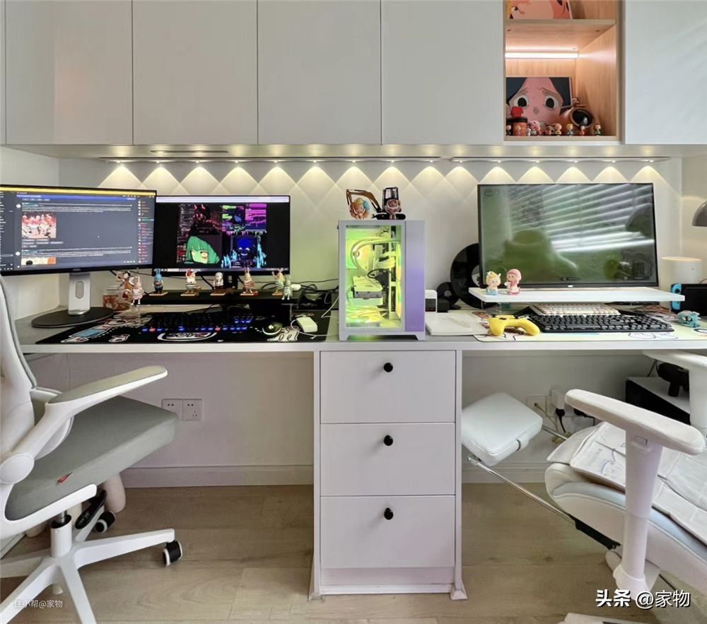 左侧丈夫的桌子部分,最多可以放下两台显示器,桌面空间很富余,个人感觉最妙的是吊柜下面的照明灯,它代替了原本桌面台灯,提供了足够的照明和氛围感,又更节省空间,确实好用。