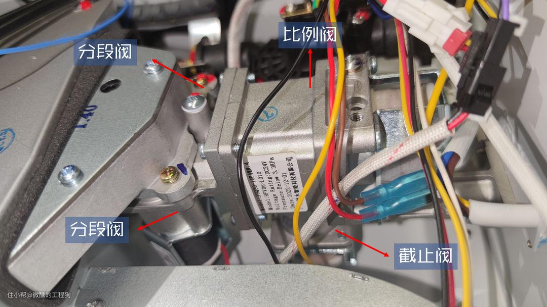 - 最后两颗分段阀,也是用来调节火力大小的,可以提供3段不同的火力,再藉由比例阀精细调节天然气流量,可以做到最小3kw的供热量。