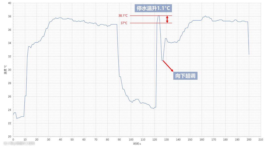 - 整个过程最高温度仅37.1°C,这个表现相当出色,特别是现在夏天入水温度高,水温是很容易向上超调很多的,但小米这个几乎完全没超调,避免了开机初期被烫一下的不良体验。