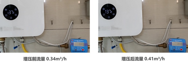 增压前流量0.34m³/h,增压后增加到0.41m³/h,增长了约20%,说明增压效果是确实有效的,建议家里水压小的同学把增压功能打开,有助于提高洗浴体验~