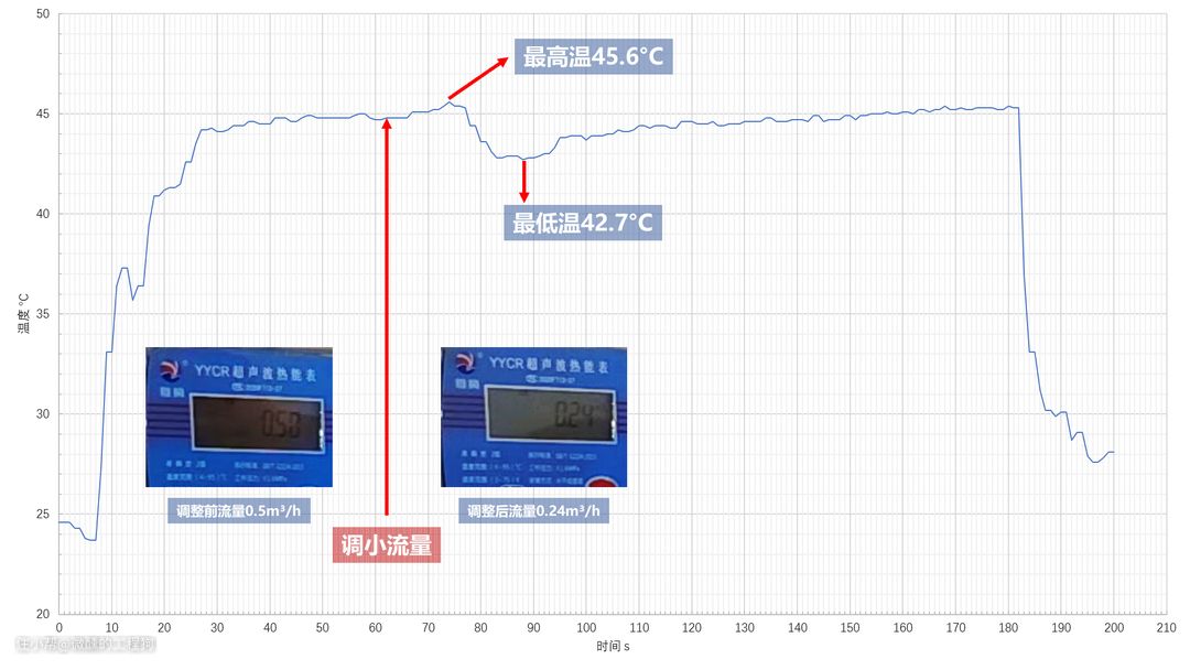热水器温度设置为45°C,然后开启水龙头,记录下全开时水流流量为0.5m³/h,待温度完全稳定后,调小水龙头开度,流量降到了0.24m³/h,不足原流量的一半,人为制造了非常大的波动,理论上温度应该大幅上涨,待出水温度计发现情况不对后,再调整燃料供给降低温度,但小米1S在限流后最高温度仅45.6°C,几乎完全无变化,然后温度反而向下调节了一段,降至42.7°C后再慢慢恢复到设定值。