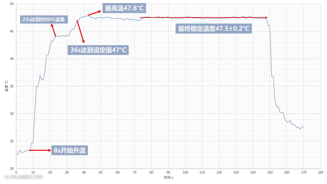 - 最终在96s时,温度完全稳定,出水实测温度36.7°C,波动±0.1°C,考虑热电偶本身的精度和波动,几乎就是完全恒温,表现极其出色。