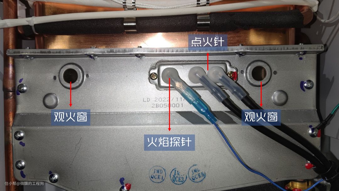热水器中间这段银色部分是它的燃烧器,天然气和空气在此处混合燃烧,产生高温气体加热我们所需水流,两侧的小孔是看火孔,检修时维修师傅从这里观察火焰状态,中间两根黑线连接的是点火针,它们通电后产生电火花点燃燃气,它们的左边是火焰探针,用于检测点火是否成功,万一没成功的话,及时停机避免燃气泄漏。