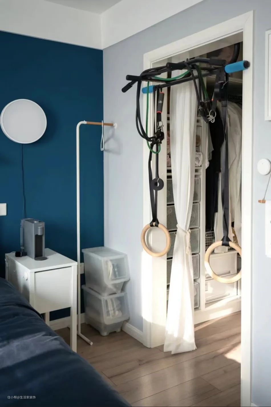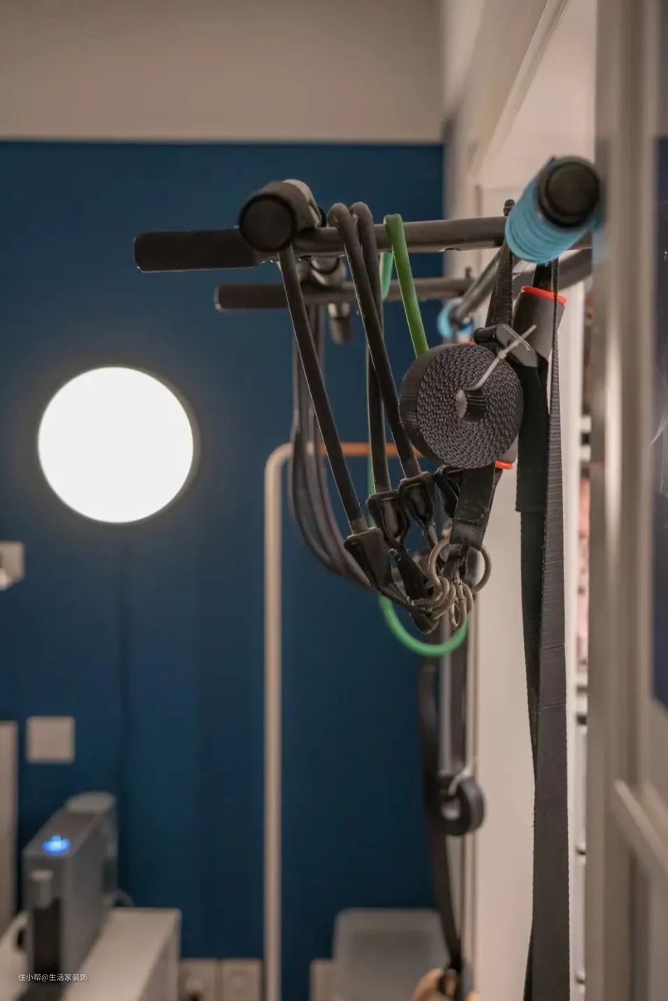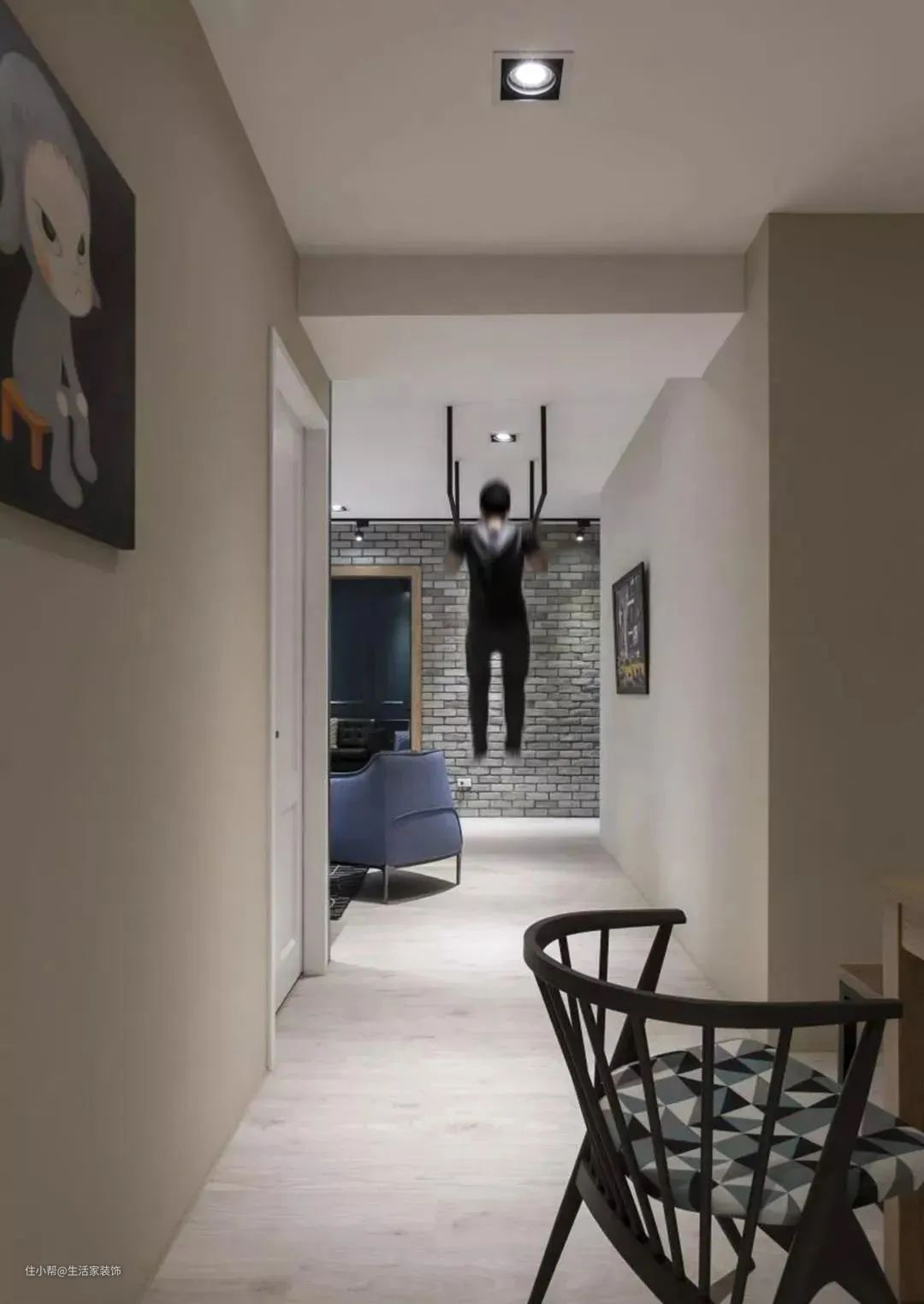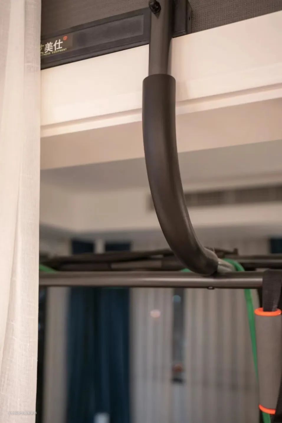 天花板上可以安装U形单双杠,铁艺的杠体特别适合工业风,黑色杠体搭配极简或北欧风也不违和。女生不要以为单双杠只适合肌肉男练引体向上,其实就算是简单吊在单杠上这个动作,对脊柱就很好,同时在固定上半身的情况下匀速屈膝抬腿,对锻炼核心力量也很有好处。