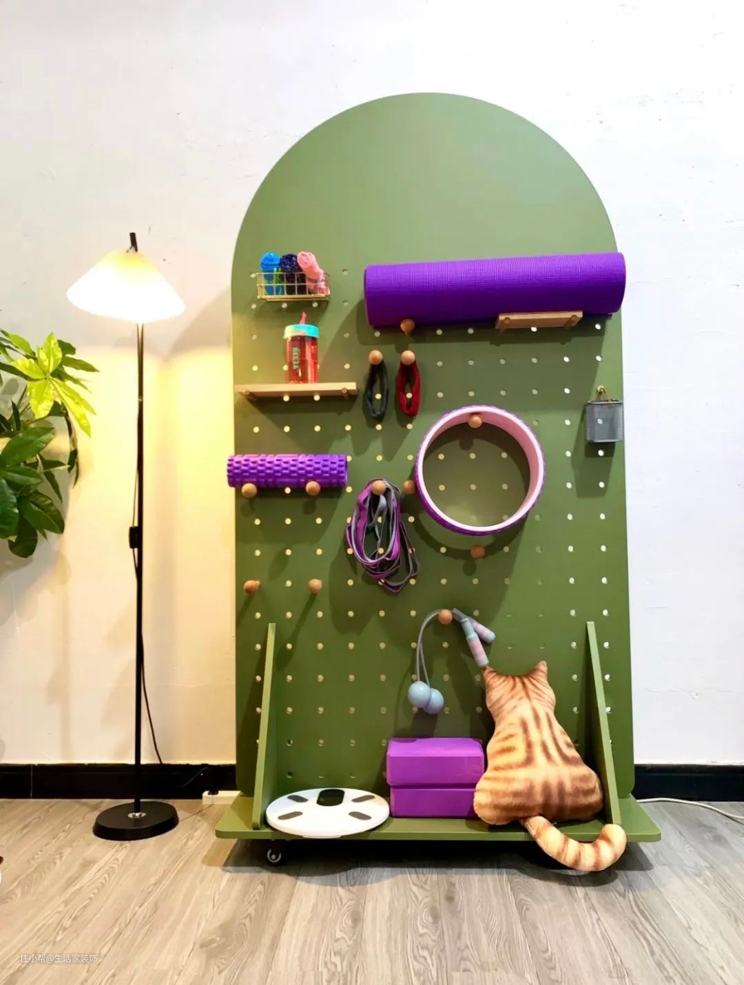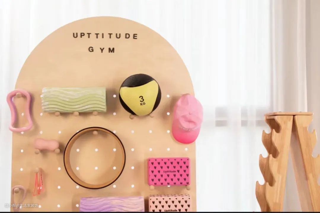 地板上墙,通过圆柱木在墙上固定安置健身器具,井井有条,方便取用还不占地方,作为墙面装饰也很特别,用过都说好!
