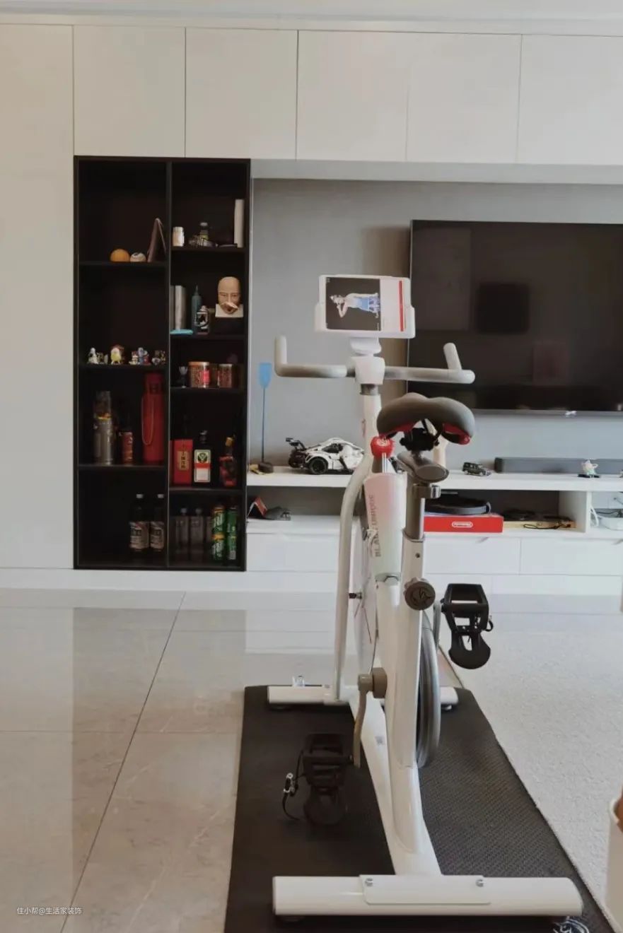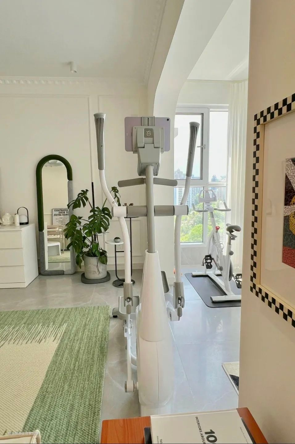 客厅作为家中空间较为宽敞的地方,承载了更多功能性。适合放置跑步机或动感单车之类的器械,使用时不会影响到其他人的正常活动。另外跑步是有氧运动,会呼出吸入大量气体,需要通风较好的环境。