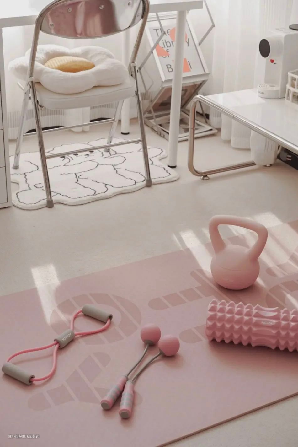 如果是两代同住,不方便在客厅放置过多器械的家庭,利用一张2㎡的瑜伽垫,也可以布置成为一个健身角。