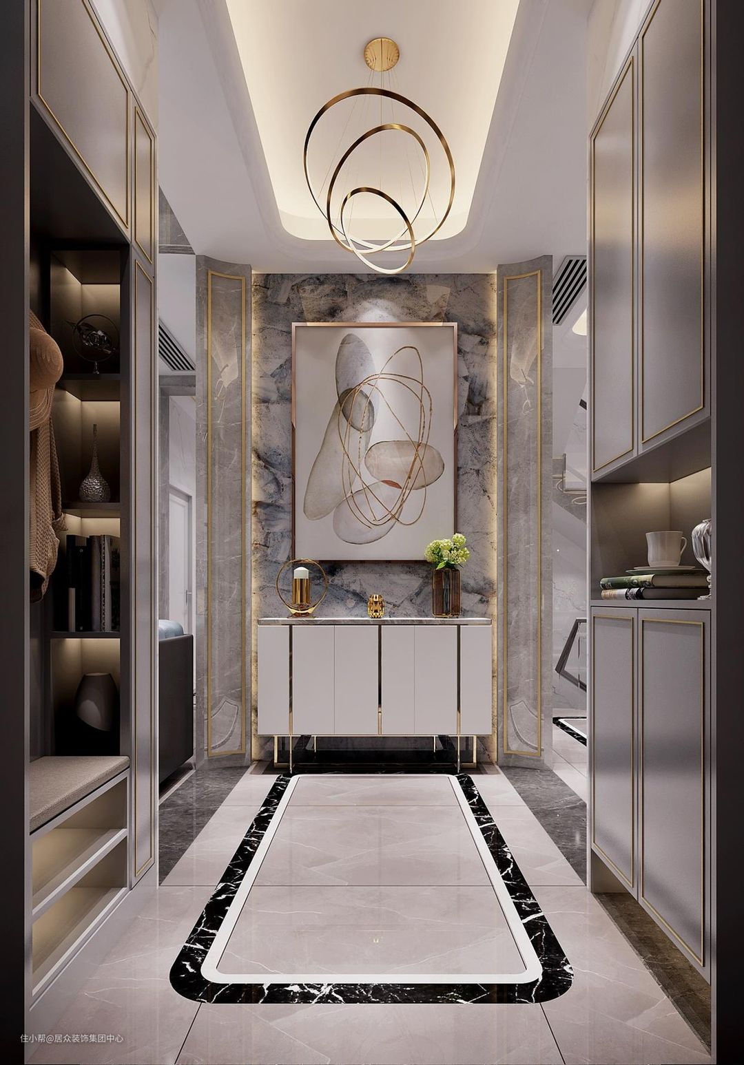鞋柜中间设计留空区入户后方便将手中的随手物品放下便于换鞋等操作,还能摆放装饰品提高品位,中间留空鞋柜上下分层对小户型来说有放大视角的作用不会显得过分拥挤!