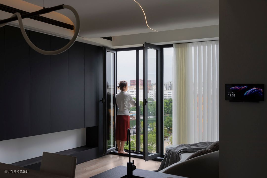 拆掉原有的阳台移门,并将其纳入室内,进一步拓展了使用面积,且最大化引入了光线。这样即便空间是以黑白灰色定位,也拥有了充足的采光。而白色梦幻帘的存在,也一定程度上削弱了黑色的硬朗,多了一丝柔和。