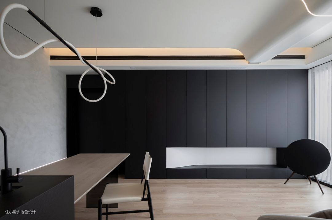 细节:储物柜下方的镂空背板,以弧形的方式来设计,既是为了与吊顶造型呼应,也为空间带来了一丝艺术美感。当然,适当的留白也弱化了黑色柜体的厚重。