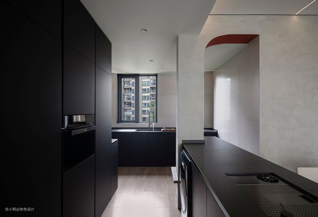 当厨房外的小阳台合并进来后,由于中间有一根承重柱,所以直接给门洞设计一个半弧造型,再涂刷上一抹宫墙红,肆意又跳跃。而将洗烘一体机内嵌在中岛柜里,也是一个比较实用的小处理。