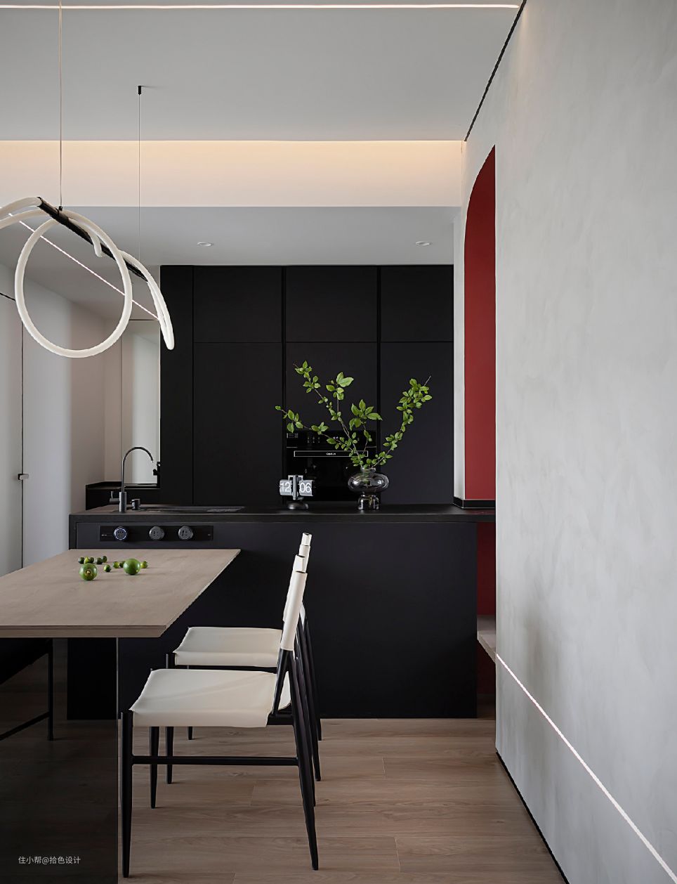 入户第一视角就是一体化的餐厨区,右侧墙面再次用一条线性灯贯穿,满满的空间仪式感,且让水泥漆墙面更有质感了。