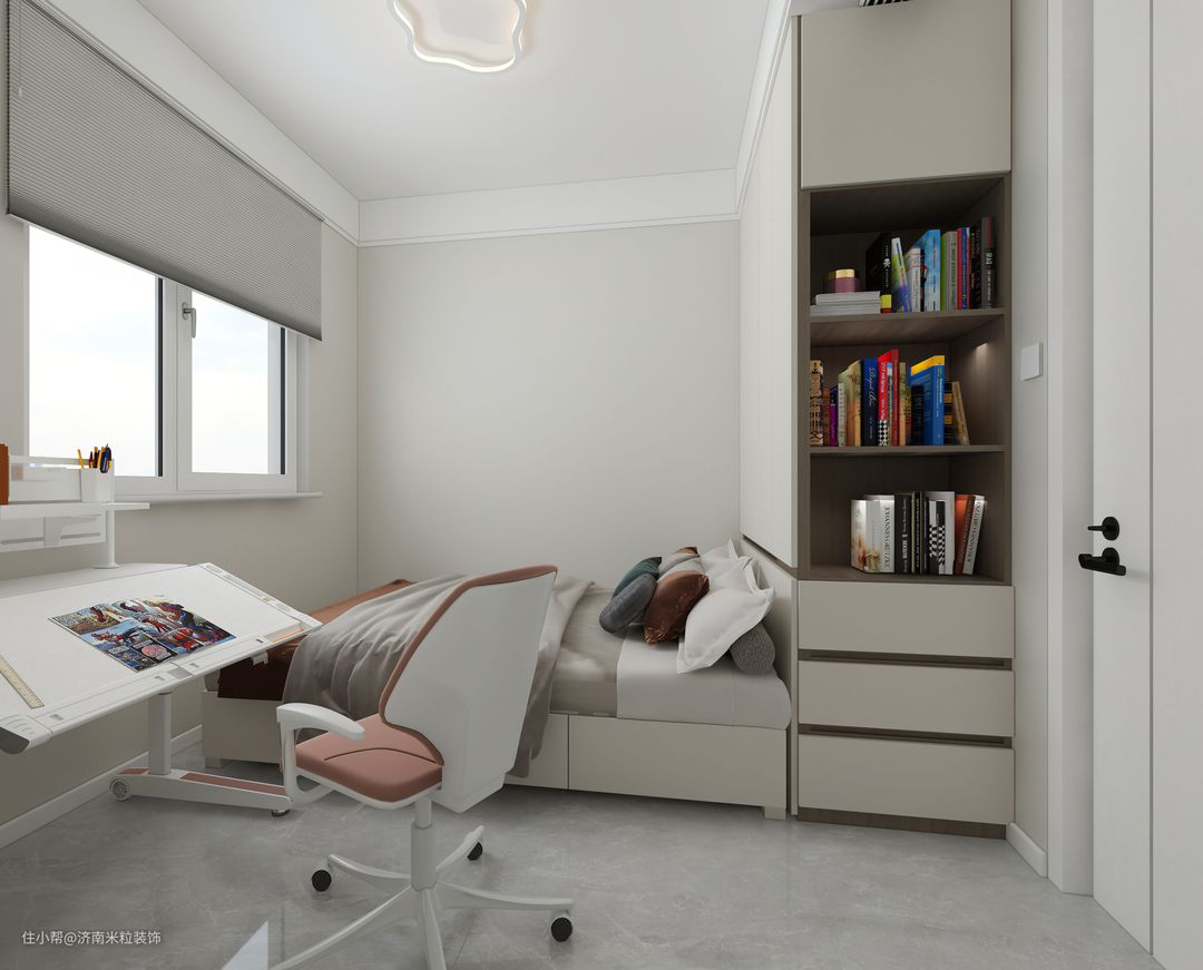 我们进门就要安开关开灯,所以不能做封闭,做个开放格,把开关移到开放格侧板上。侧柜上方做侧开门,不要做顶板,平时正常储物,打开门可以正常检修空调。中间给孩子设计了书架,孩子的书也有地方放啦。侧柜正面做同门板高的假门板,正面外观更简洁。