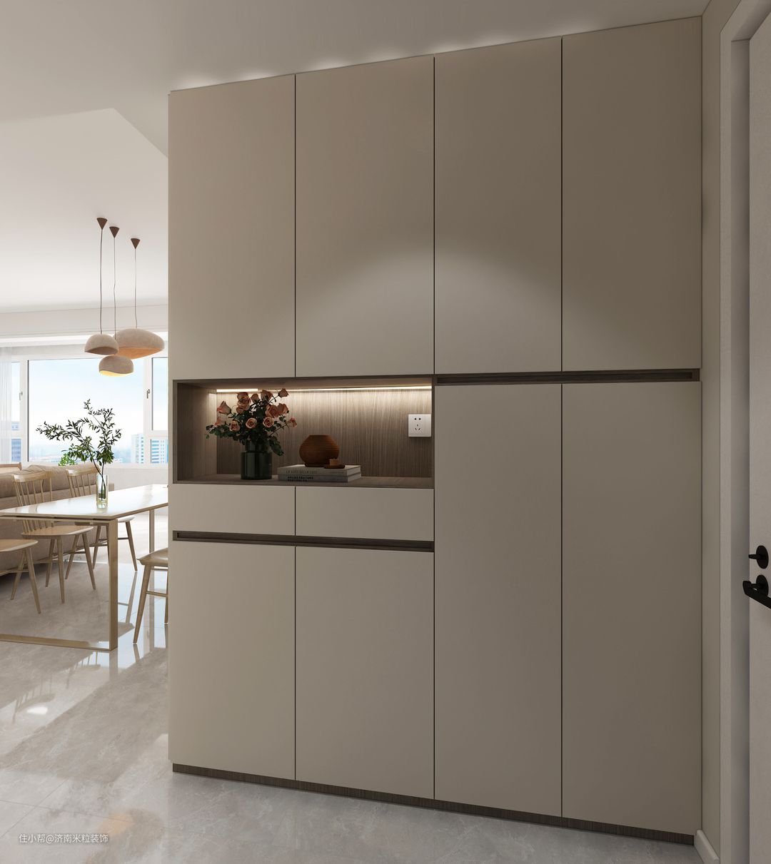 中间做镂空,方便拿取包包钥匙等随手要拿的物件,再往下做了抽屉,我们可以收纳鞋套,口罩等等避免放在桌面上显得杂乱。右边做挂衣区,风衣外套通通可以挂。简约风格的家人们有条件一定要做隐形拉手,简单大气,也避免了传统拉手容易磕碰。