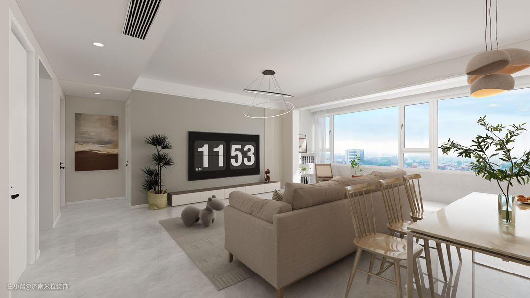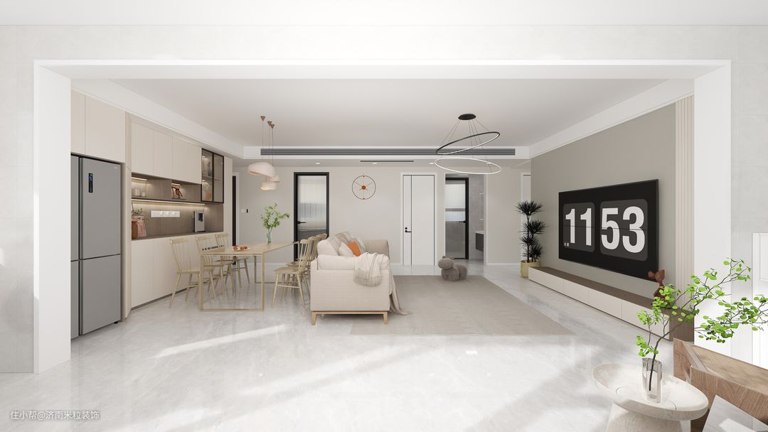 户型是横厅设计,没有障碍紧密相连的客餐厅,让家的氛围感更浓郁了一些,也完成了边看电视边吃饭的梦想。直排沙发和长桌的组合最佳,视觉观赏性也更强。