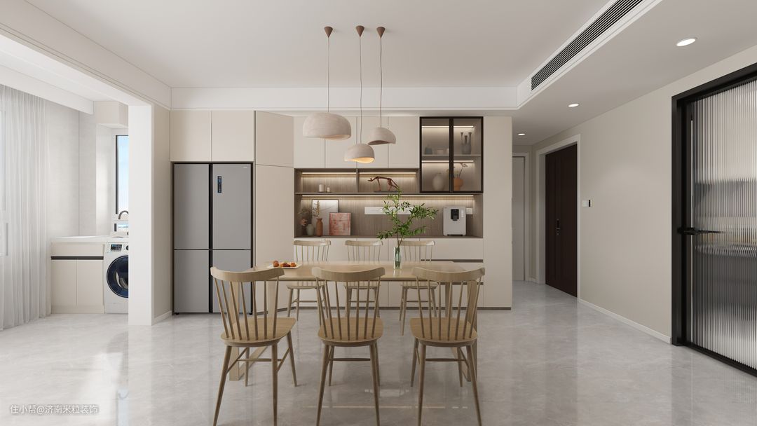 斜角餐边柜,不仅好看实用性还特别好,解决了柜子和冰箱的角度问题,巧妙的用斜角连接了两个柜子,让餐边柜变得完整,整体性更好。酒柜冰箱柜一体,收纳空间充足又好看,中间可以设计开放格,安装轨道插座,实用又方便。