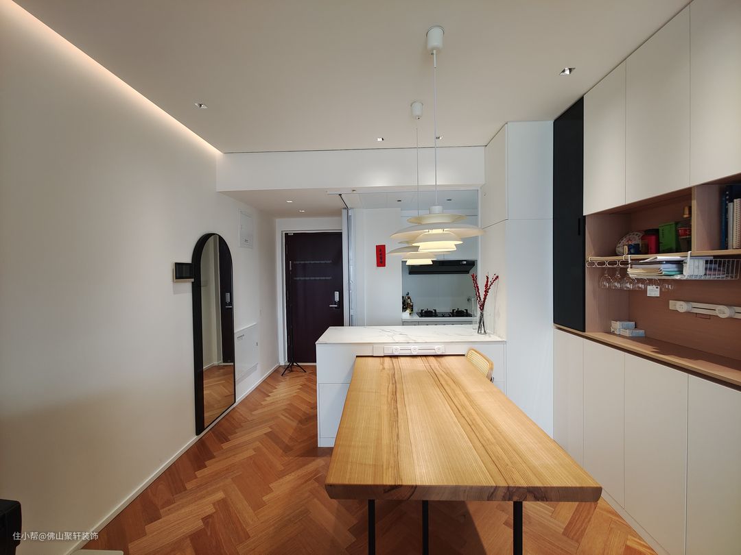 餐厅延续了现代极简风格,以简约洁净的线条勾勒出时尚大气的造型,同时,餐桌+中岛台的组合,让这个空间有了更多的可能性,原木系的餐桌加大理石的中岛台,两种不同的材质却在这个空间实现了融合,营造出了一种安静,祥和,舒适的氛围,让人瞬间忘却都市的喧闹和工作的烦恼。