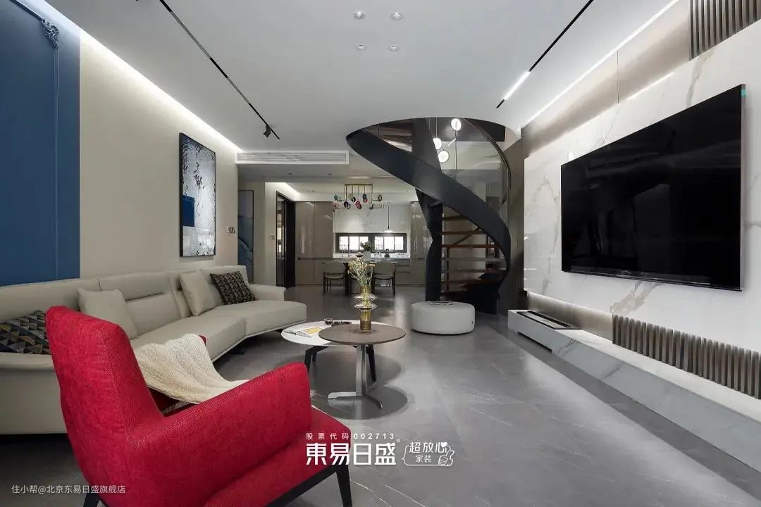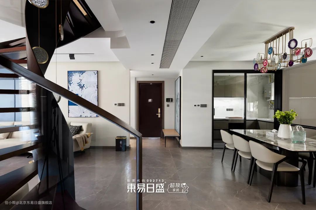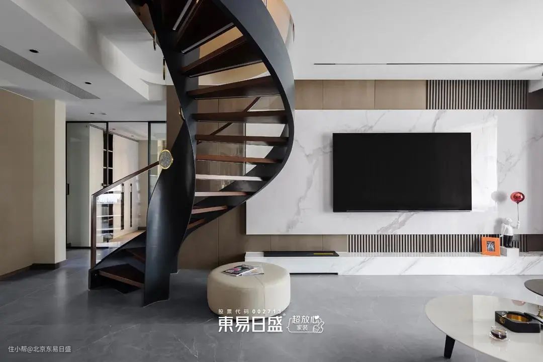 每个人心中都有一个关于旋转楼梯的执念,完美呈现的背后是东易工人师傅们的一丝不苟。侧边玻璃扶手搭配悬浮式胡桃木踏板,高级感十足。