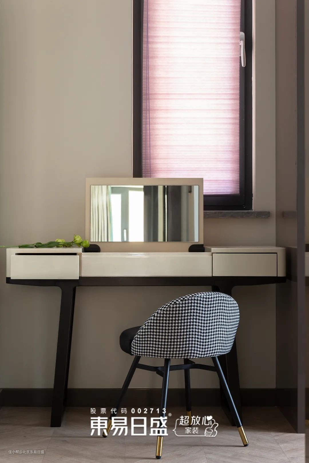 独立的衣帽间在两组顶天立地的衣柜加持下,仪式感满满。紧邻小窗的位置,设计师安放了女主人的梳妆台,元气的、精致的一天就从这里开启。
