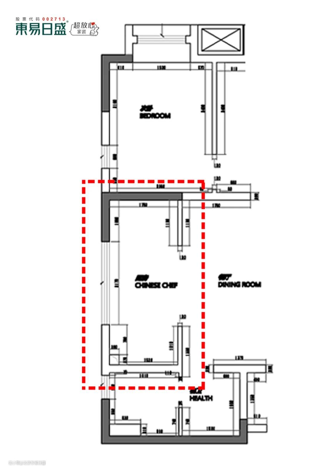 ⑤ 将原始厨房、餐厅、客卫全部打通,打造宽敞独立的中厨+西厨+餐厅区域。