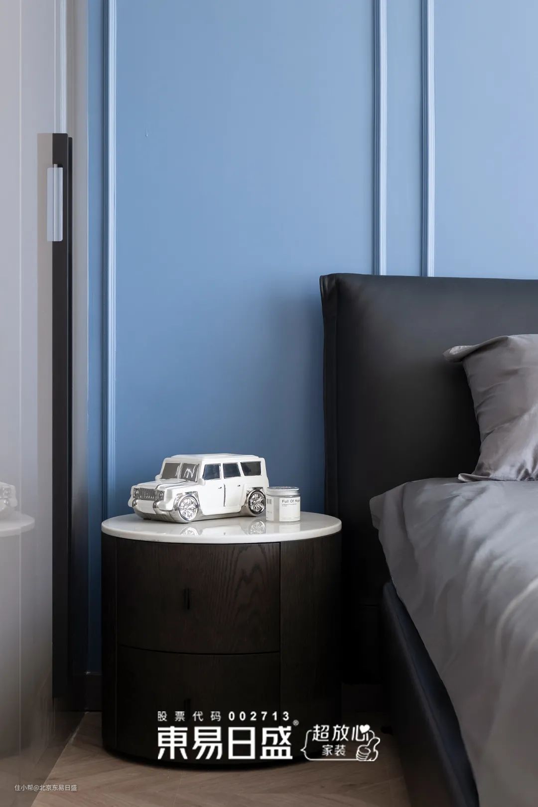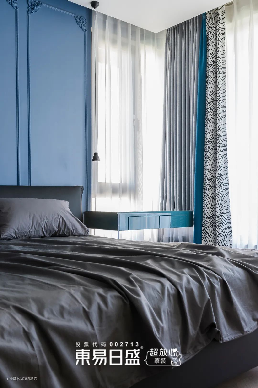 设计师以静谧的蓝色+石膏线的搭配,为男孩子准备了一处个性十足的独处空间。