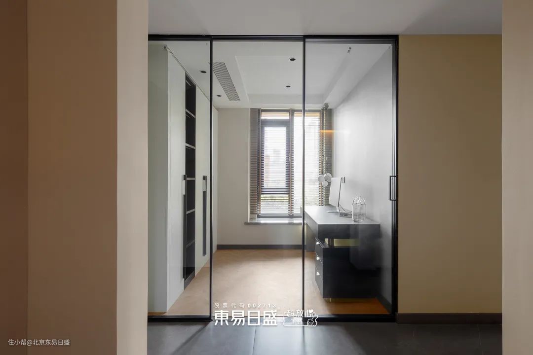 原始衣帽间面积较小,且正对入户门,因此设计师将其改为书房。吊柜玻璃门既保护了隐私,也为进入主卧增加了采光。