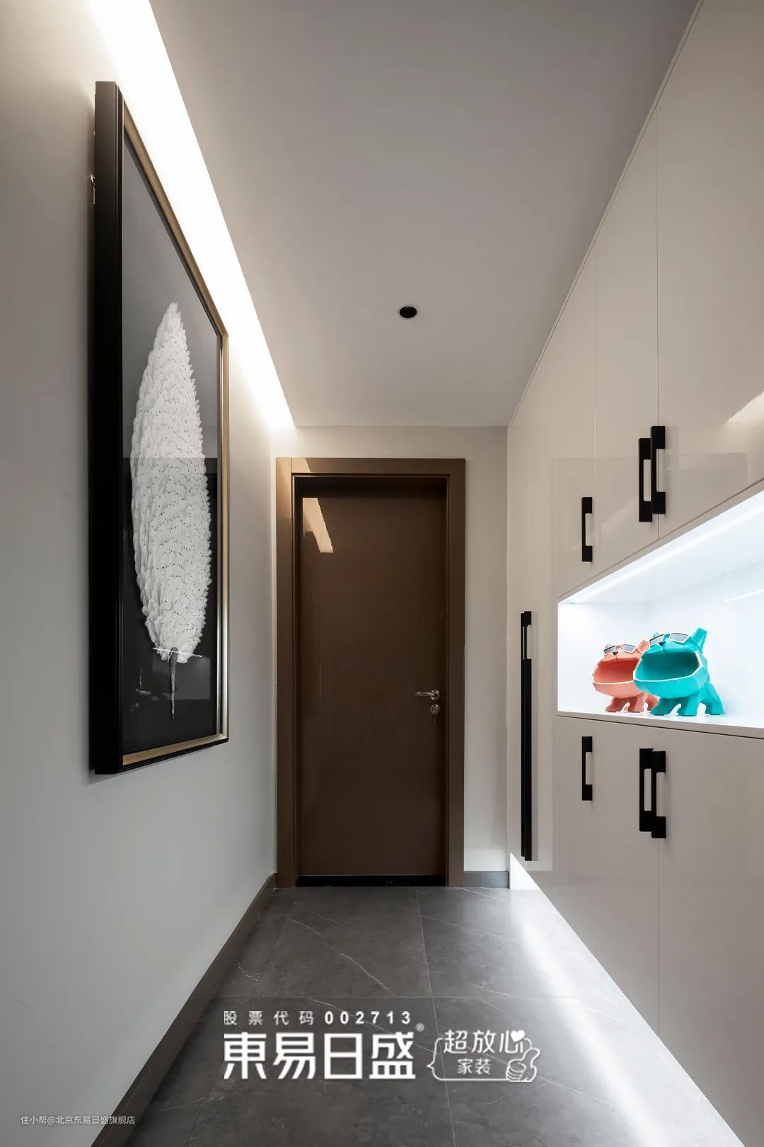 整个玄关柜隐藏在通往次卧的走廊中,强大的储物能力让空间更加整洁利落,为归家之人增添更多日常便利。