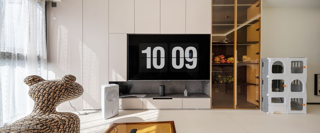 因为业主夫妇对收纳的需求很高,所以设计师提出将电视背景墙利用做成储物柜,留出足够的位置将电视机嵌入,美观又实用。