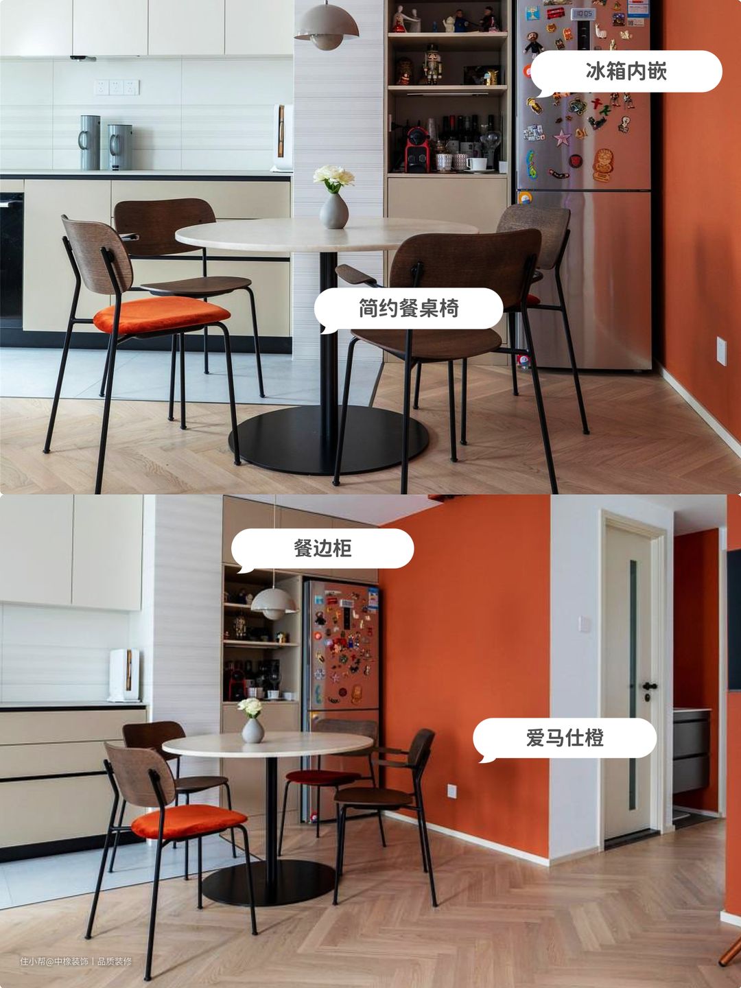 ✅经典圆桌搭配细腿铁艺餐椅,小巧的餐厅充满了轻盈与舒适,同时又不失优雅,局部点缀着爱马仕的橙色靠垫,与身后的彩色墙壁形成微妙的呼应。