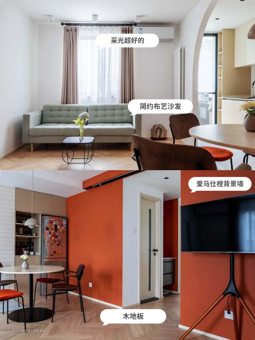 ✅客厅的主色调由纯白和原木色共同完成,电视柜背景墙大胆使用高饱和度的爱马仕橙色来做跳跃的色彩,打破了沉闷,也巧妙地将整个屋子的动与静区离开。