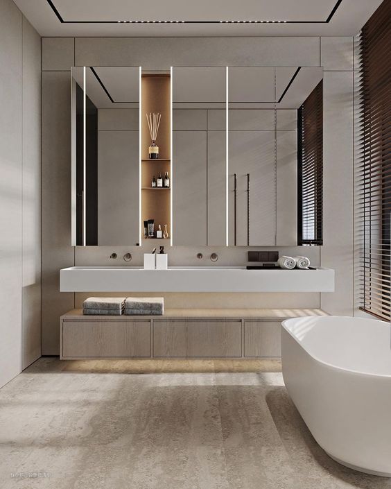 - 在卫生间中使用大面积的镜子可以增加空间感和光线的反射效果。选择浅色调的镜框或无框镜来与整体设计协调。