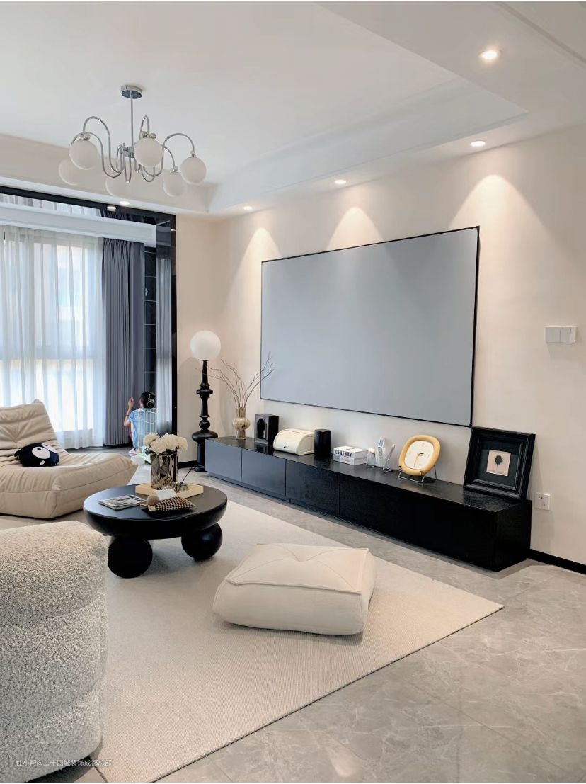 灰色的地砖,白色的墙面和顶面,这些颜色从整体上来讲都是浅色系,加入少许的黑色系,可以增加空间的层次感。黑色的电视柜,黑色的茶几和黑色的门套线,这些物件的加入,让客厅的高级感都提升了几个档次。