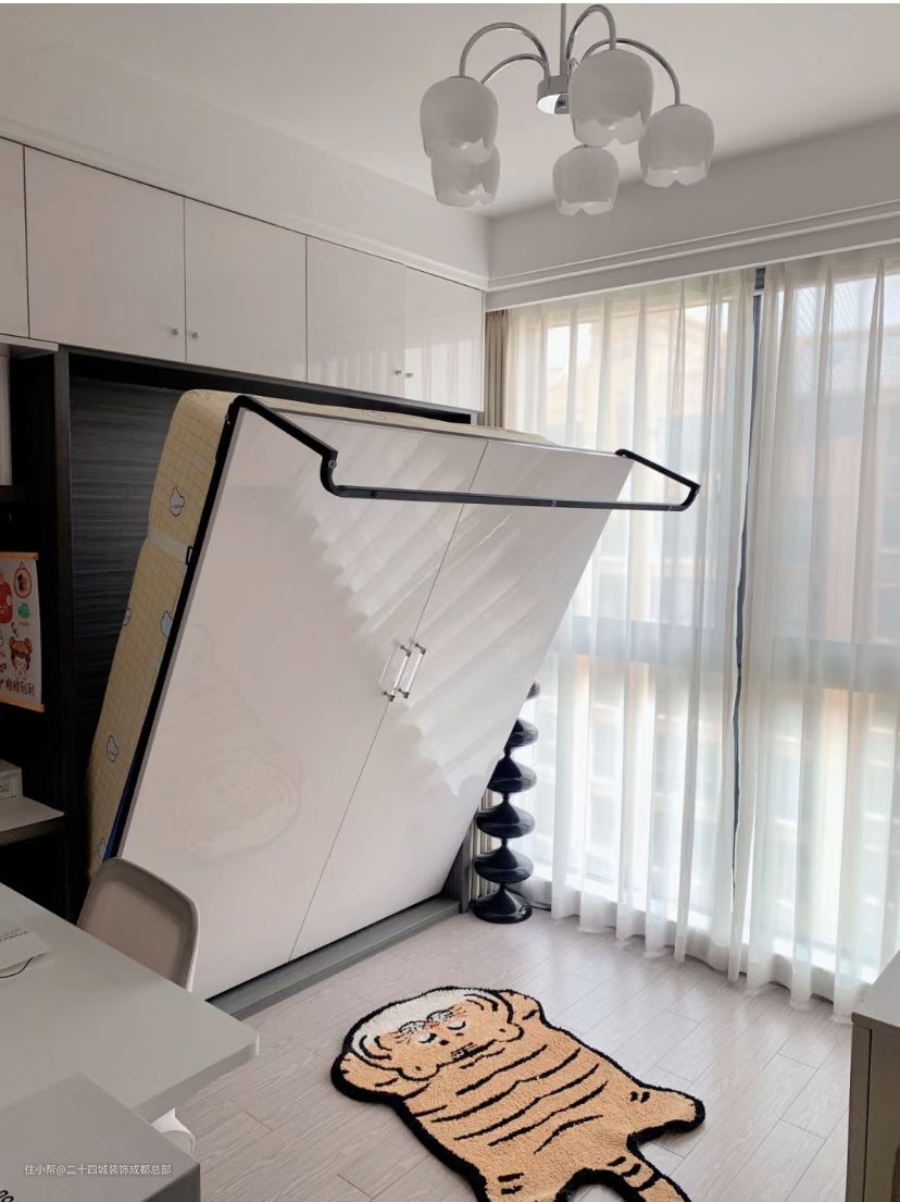 这是一个备用房间,平时都当作书房来使用,但偶尔有亲朋好友需要留宿的时候,还是需要一个客房,所以在这个房间设计了一个可收纳起来的多功能床。