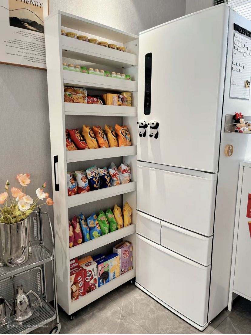 大冰箱旁边空出来的一点缝隙也不放过,放个缝隙置收纳柜装零食,摆满零食,只是看着就觉得很开心,像个家庭小卖部。