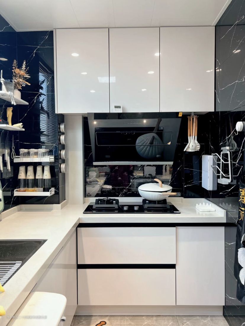 白色的橱柜搭配的是白色的台面,把手做的是黑色的凹槽式,大面积的白色和小面积的黑色,用在橱柜上面是非常合适的,让厨房看起来干净又整洁。