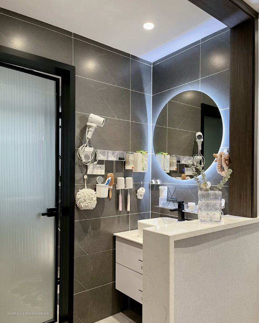 干湿分离的设计,干区侧面的墙面拆除掉一半的墙面,可以让干区的视觉效果更好一些。镜子选择带有镜灯的样式,圆圆的,打开灯光后,很有氛围感。