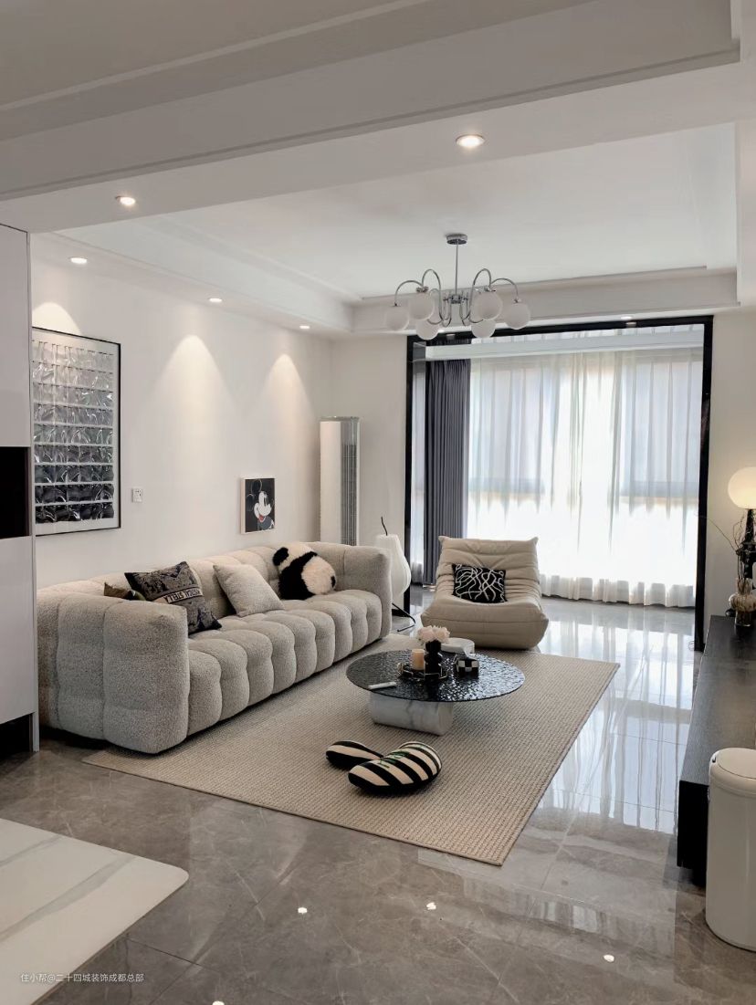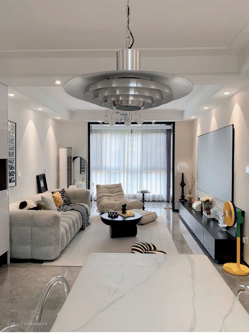 拆除移门,客厅空间整个更加开阔,清爽舒适。简单的双眼皮吊顶,下吊25公分,4000k射灯打下来灯光,氛围感满满。地砖直接通铺,整个延伸感更好,显大也好打理。