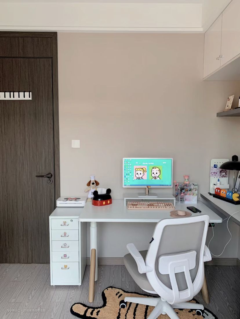 门口的位置,在原本书桌的基础上,又加了额外的一张书桌,还有一个小小的抽屉柜,可以让办公区的桌面和收纳,都能更多一些。