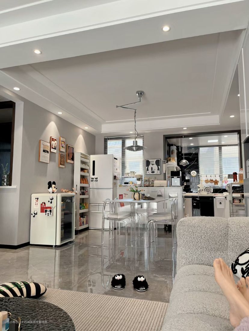 透明腿儿的餐桌和餐椅,看起来非常的时尚,亮晶晶的,是女主的心头好。其他的空间不仅收纳了一个大冰箱,还有一个专门存放饮料的小冰箱,更方便一些。