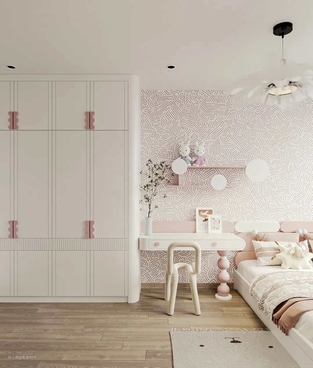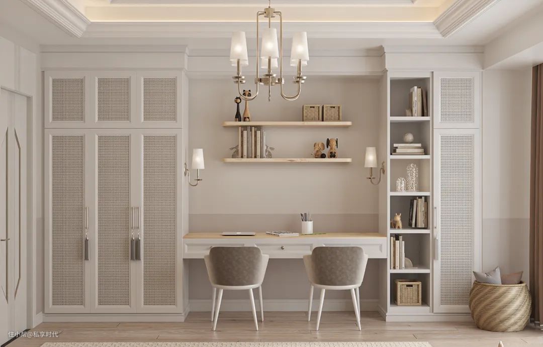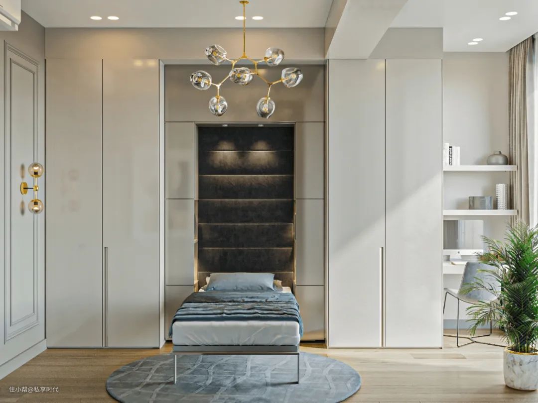 衣柜、收纳柜、书桌一体式的极简设计,让空间更显轻便、舒缓,弧线灯带的走线,与门洞型的镜面线条相互呼应,相映成趣,让孩子的成长小天地回旋着温柔、明朗而具活力的空间韵律。