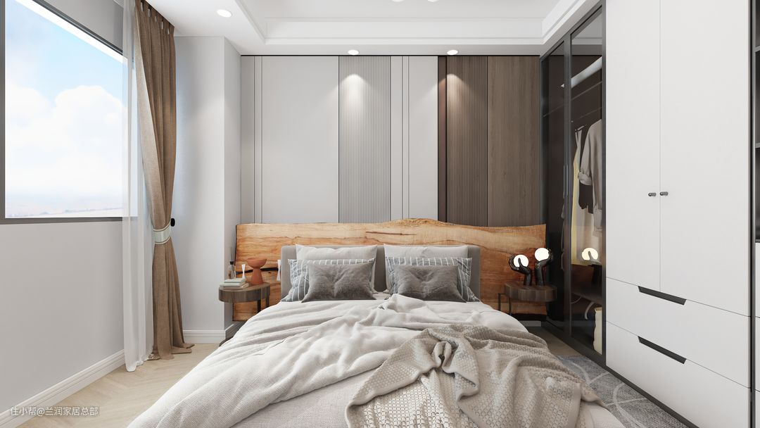 多种材质结合的床头墙,效果更加灵活多样,可以彰显出不同的空间氛围,不同的质感结合,可以带来不同的视觉感、空间感。