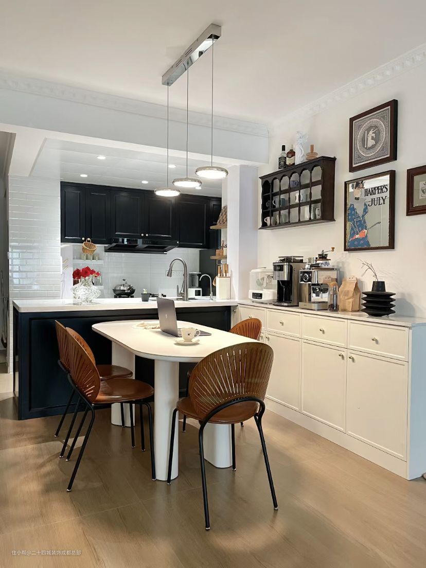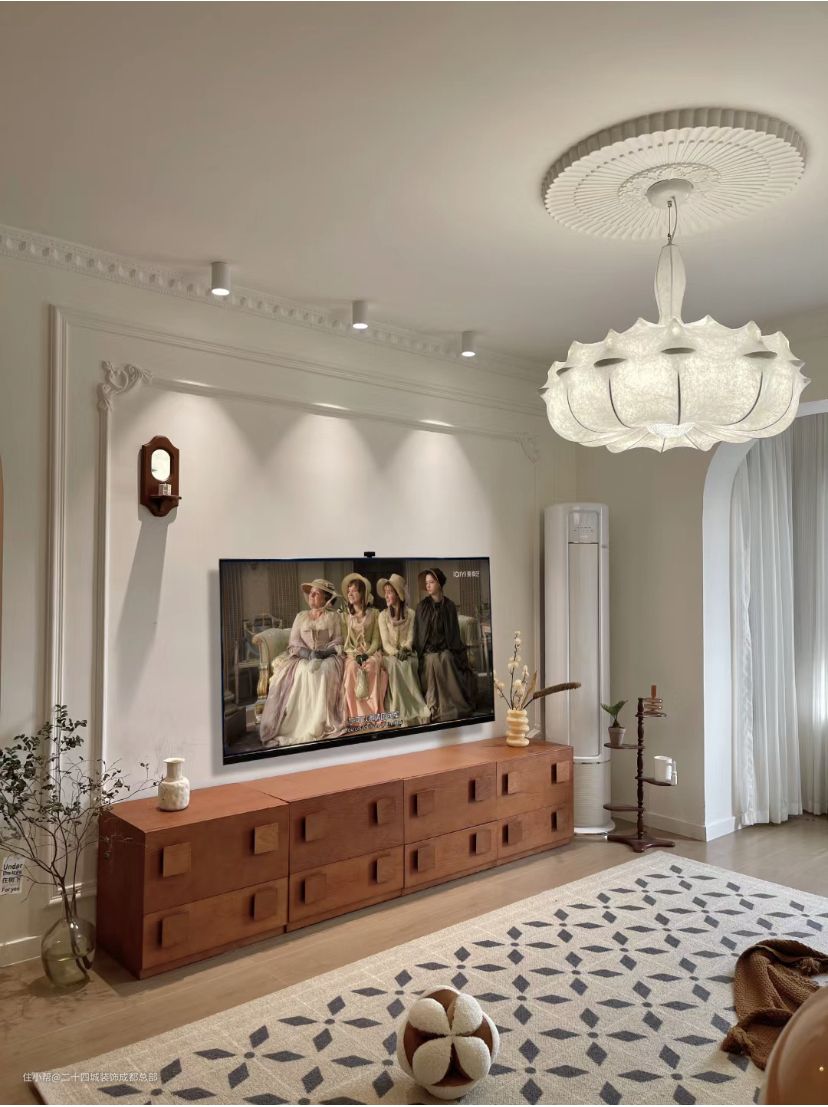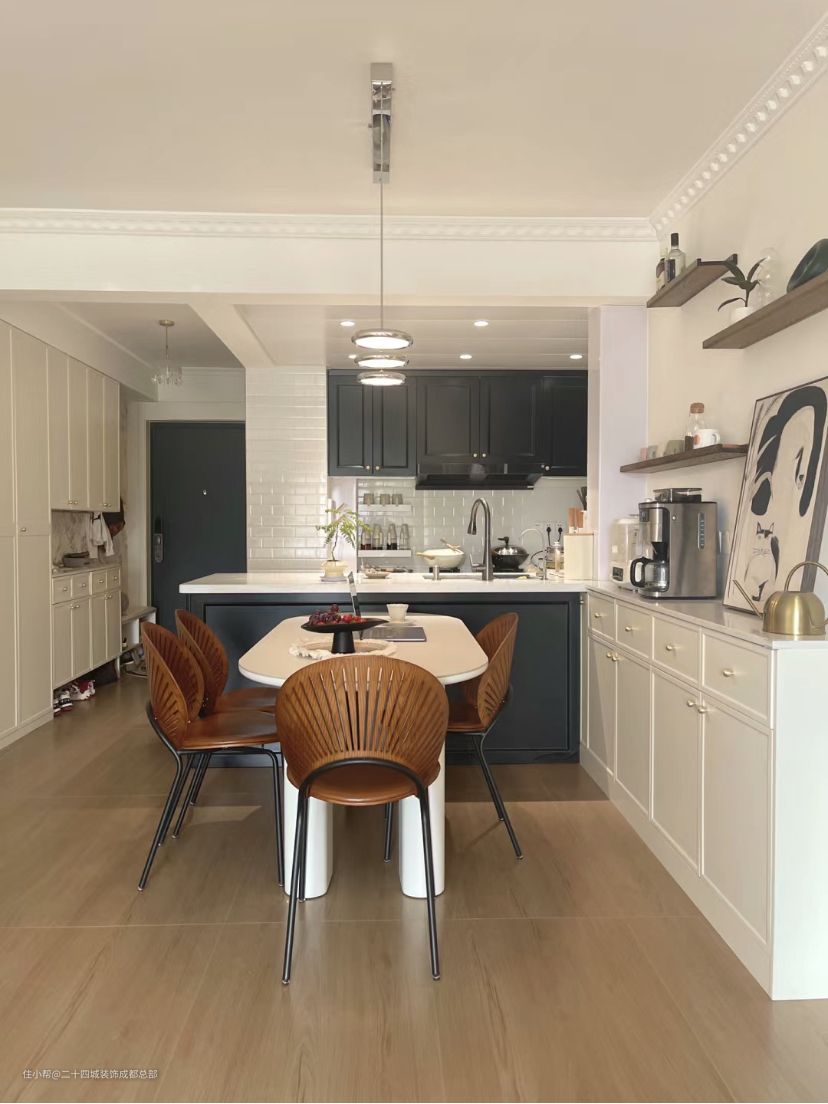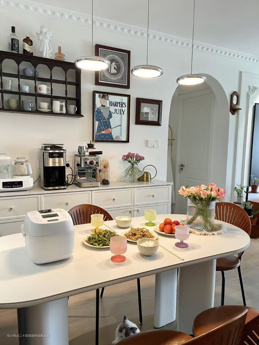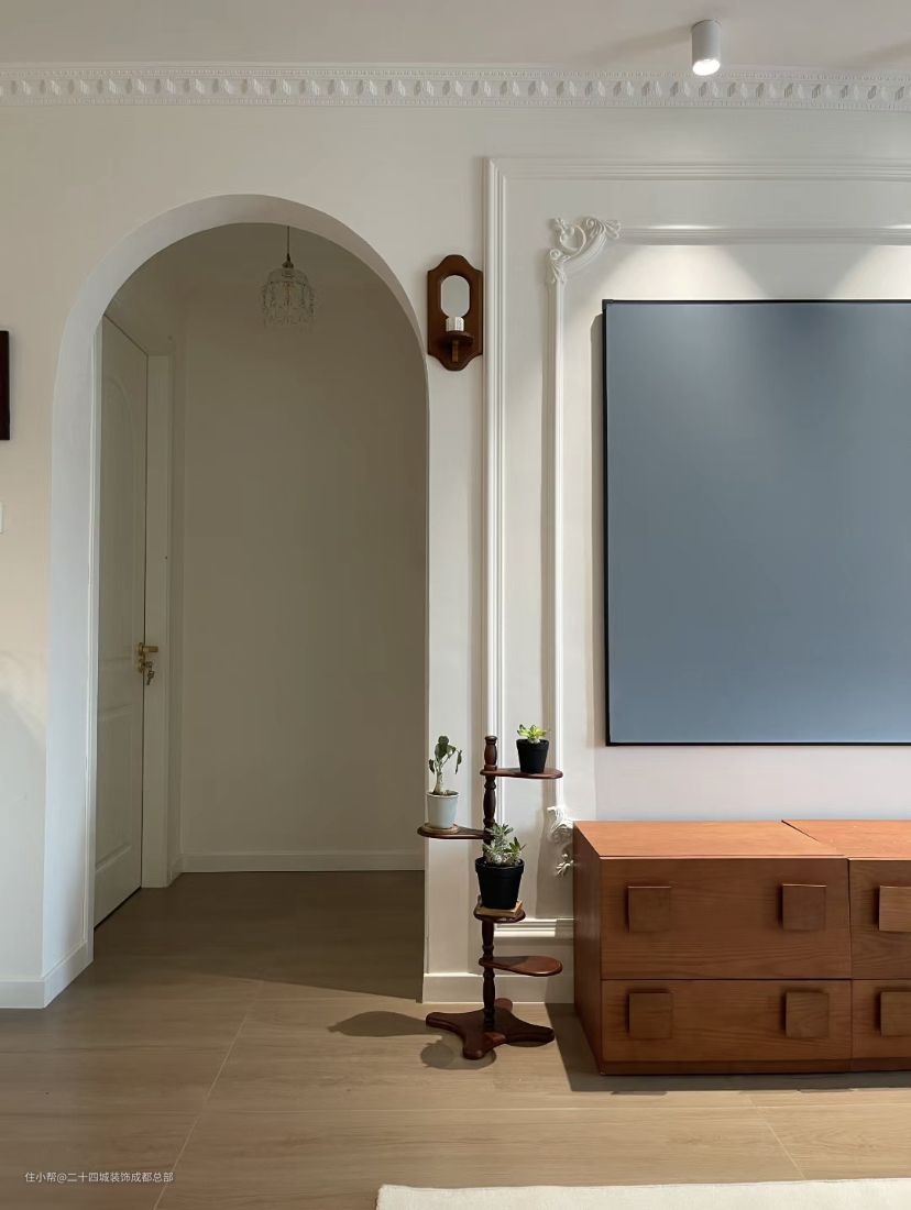 不仅是阳台的门洞做了弧形的处理,过道这边的小门洞也做了修整,弧形的门洞可以增加空间的温柔感,搭配后面的美式小吊灯,复古感十足。