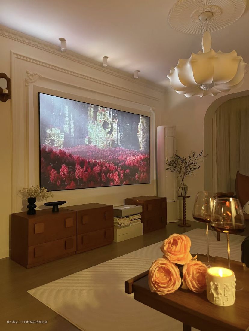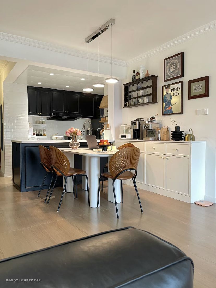 全屋无吊顶,顶部走了一圈法式石膏线,没有吊顶又喜欢小山丘的氛围感,装了明装射灯,白色跟顶部融合的很好,不会突兀。全屋通铺木纹砖,相比木地板更耐造,也能呈现出温馨的效果。