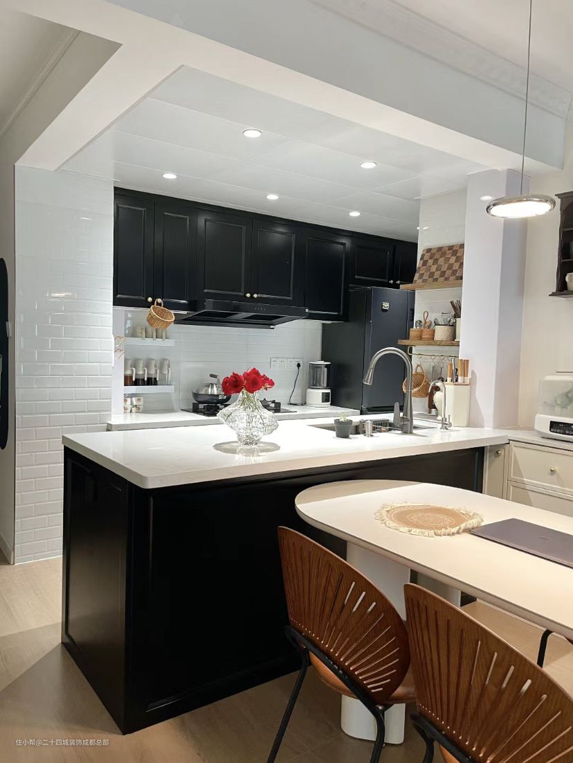 岛台长200cm,宽90cm, 高90cm,黑色橱柜是烤漆的,台面大理石纹路石英石,台面向外延伸了20cm,人少的时候可以把餐桌移到台面下面省空间。