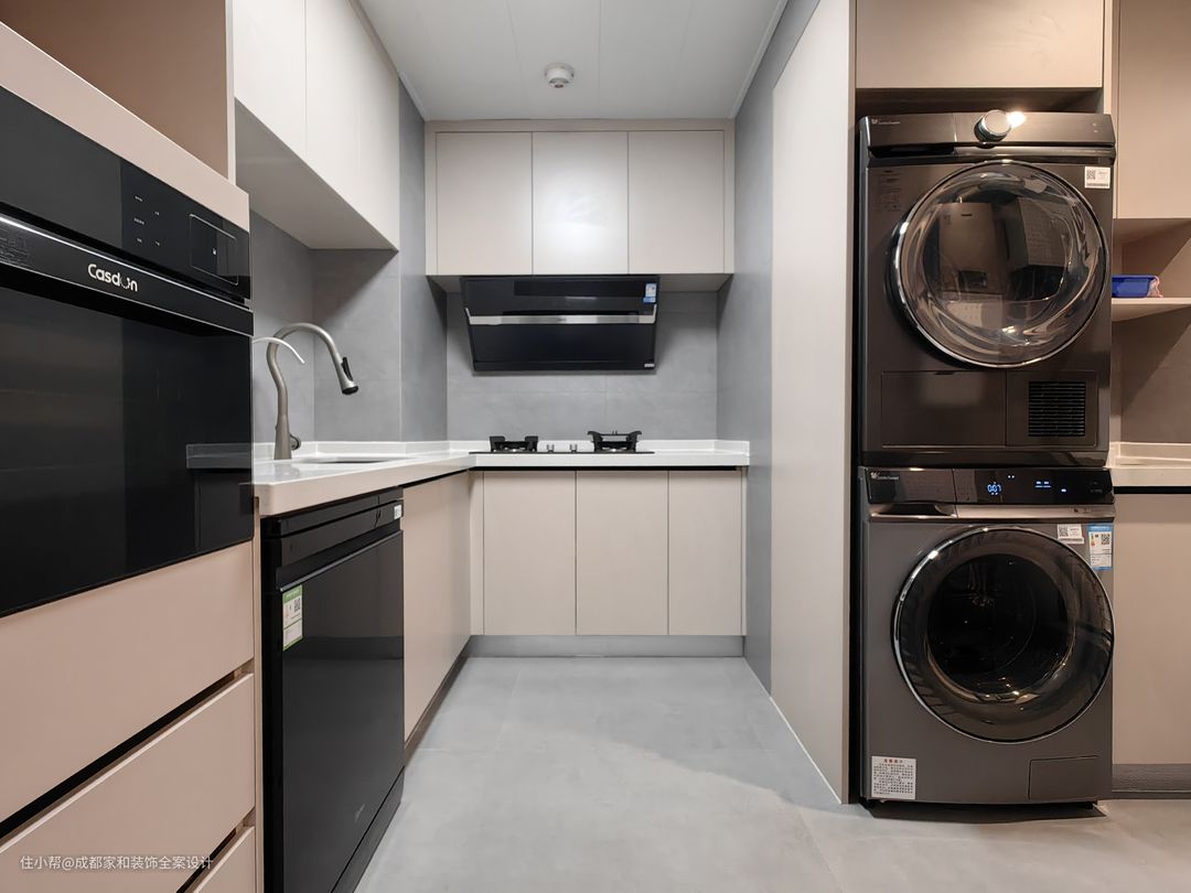 普通家庭装修洗衣机可以内嵌到柜子里,但尽量不要安装柜门,敞开使用更方便。如果你觉得洗衣机露出来真的不好看,那就不要用传统的平开门,两边都有柜门遮挡,使用非常不方便,可以使用折叠门或者口袋门,能关门也能留出足够的操作空间。