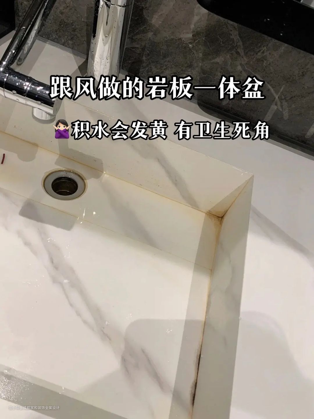 岩板质地硬,无法一体成型,如果要做成洗手盆那就只有胶粘,这样做刚开始看着很好看,用过一段时间后就会发现盆底积水还会发黄变色,清洁难度直线上升,有的甚至“不堪重负”直接垮掉。