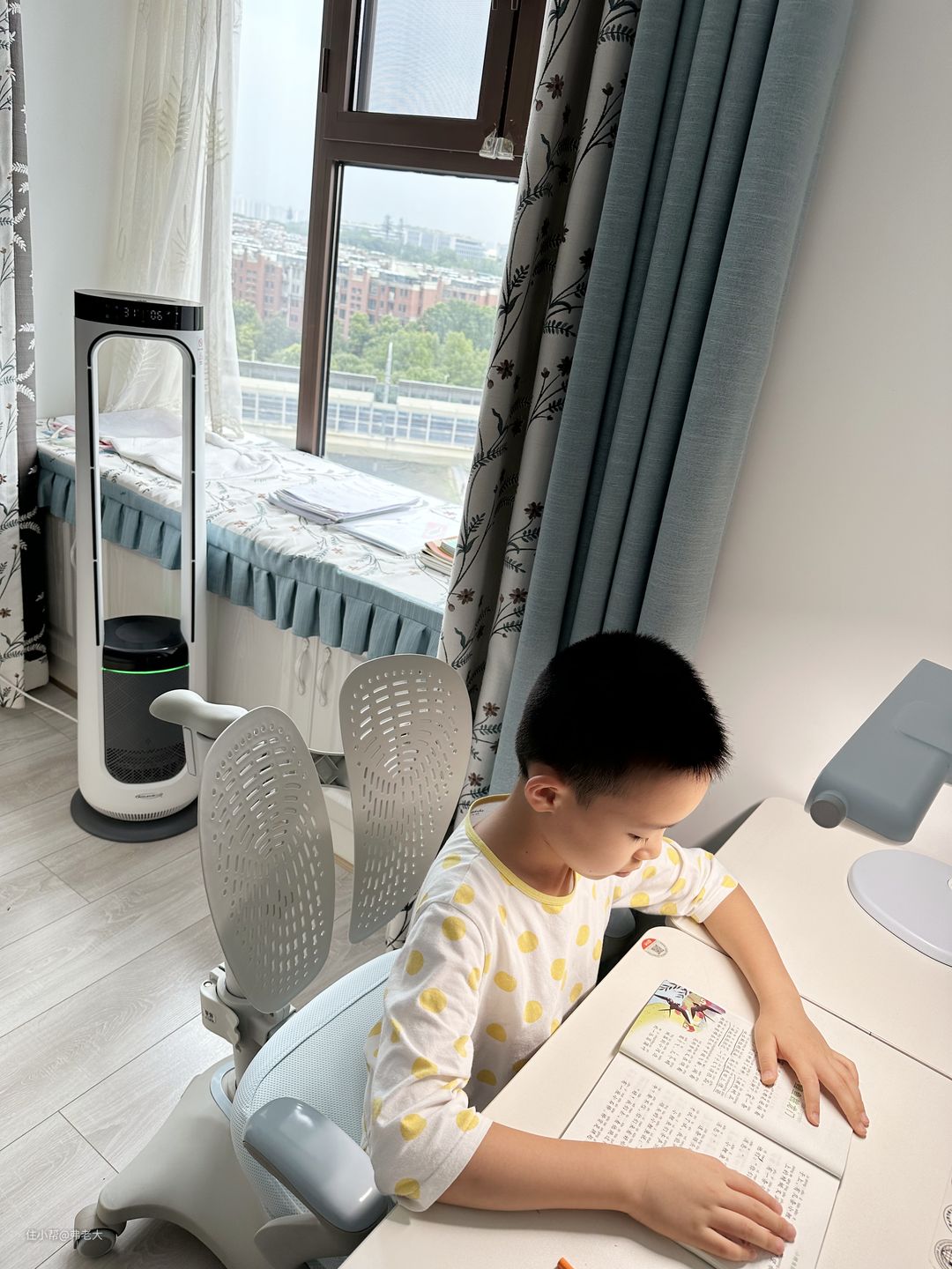 孩子做作业时,通过机身上部的触控面板就能自主操作,启动/关闭、调节档位等等,丝滑流畅,极易上手。
