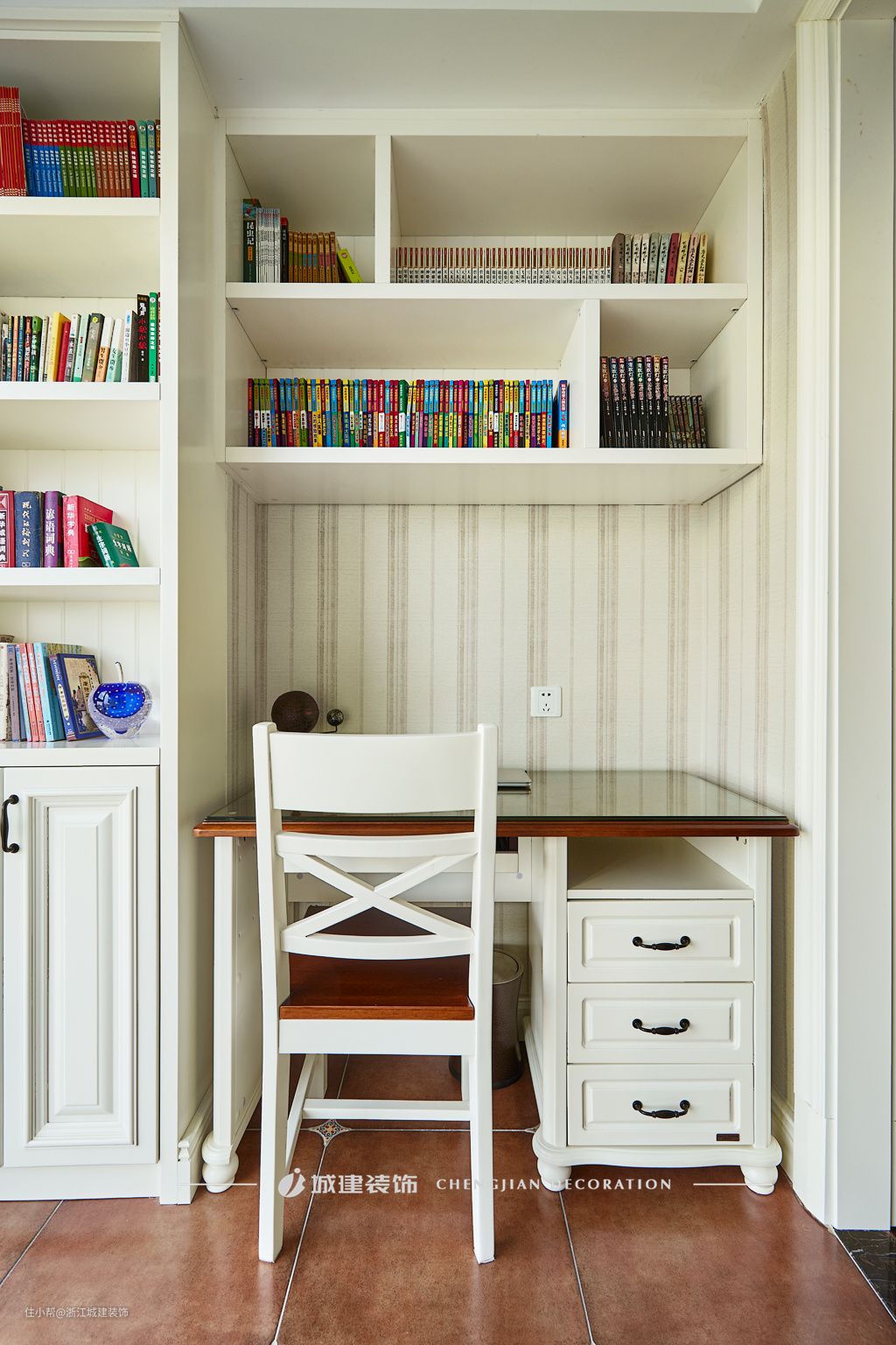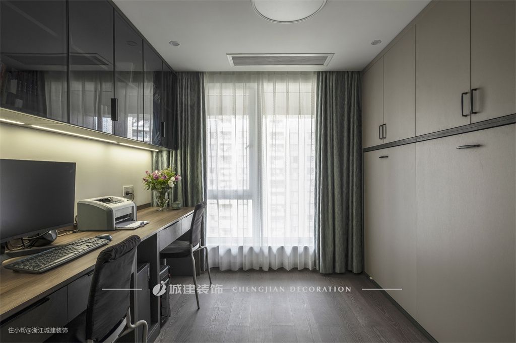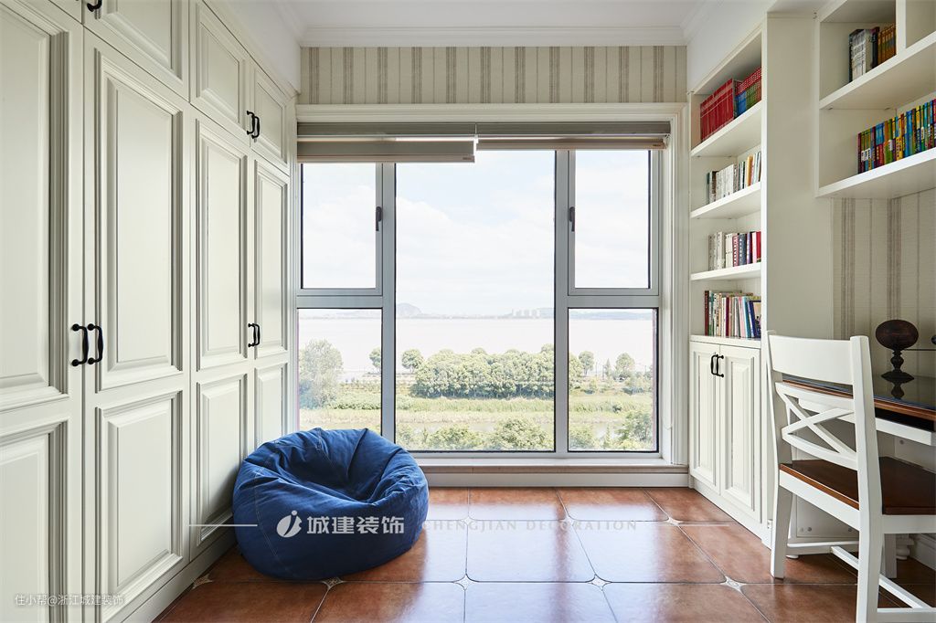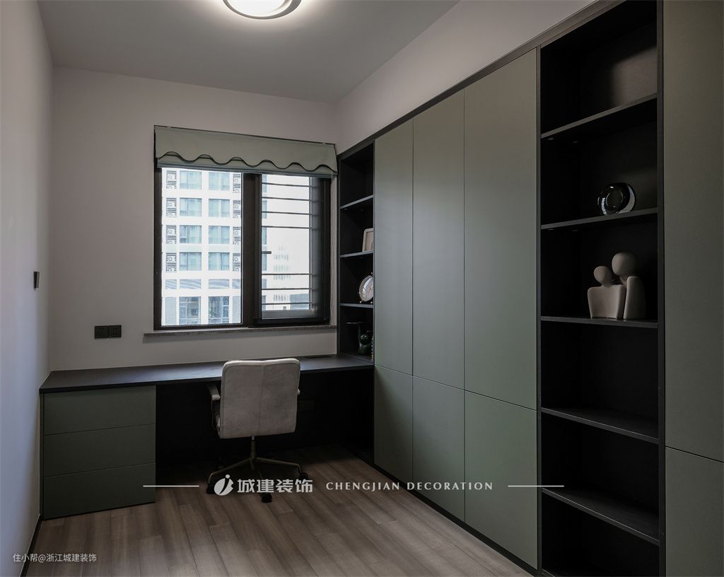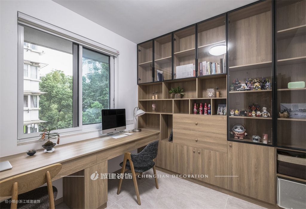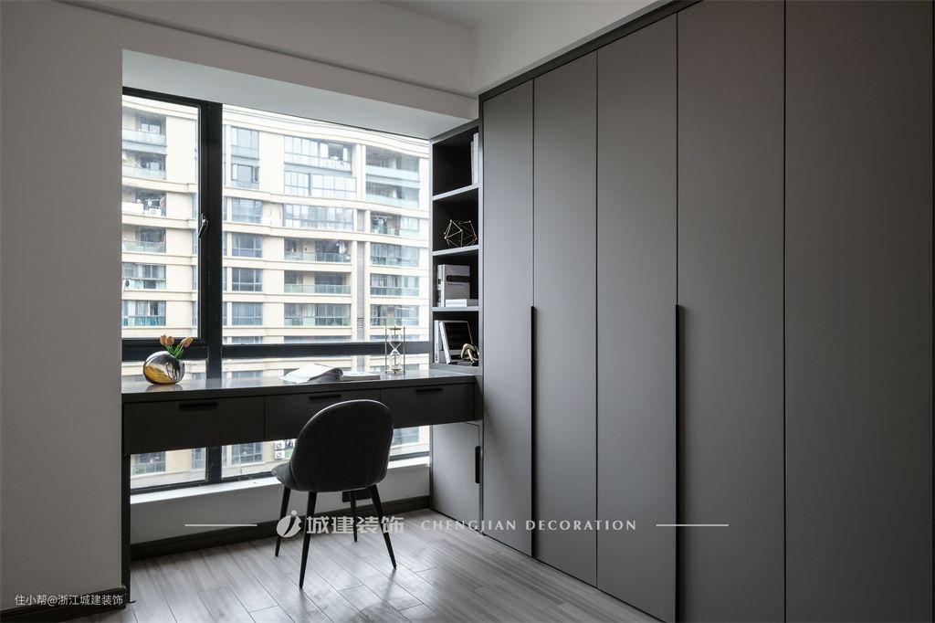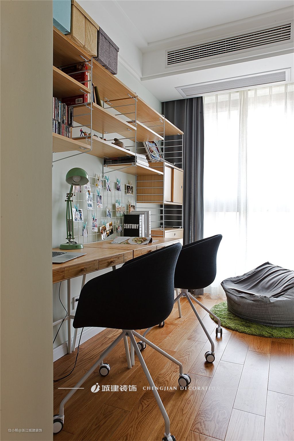 两墙之间做L型书柜书桌设计,一侧墙面做顶天到地的储物柜,另一侧做书桌设计,书桌一侧的墙体也多见有窗的墙面。无论是办公还是学习都有很好的采光保证。