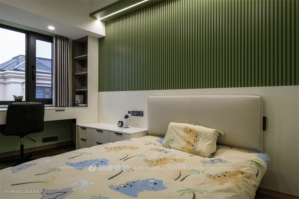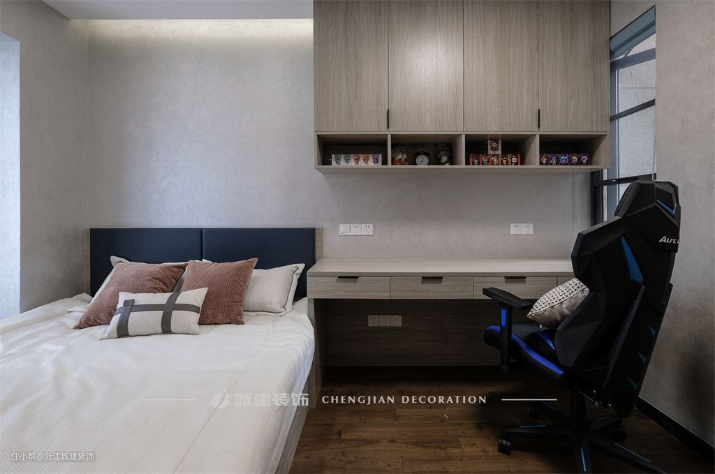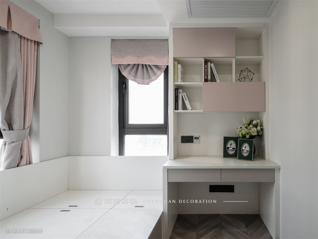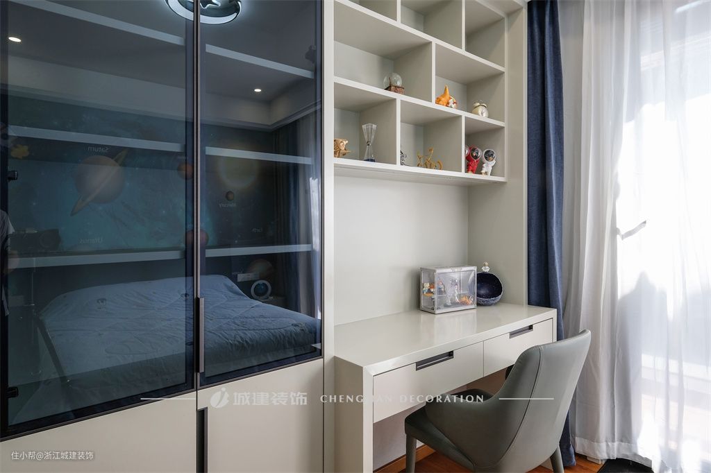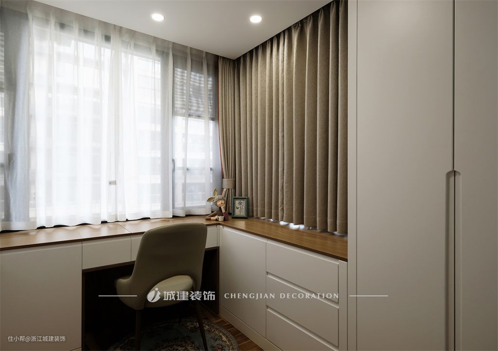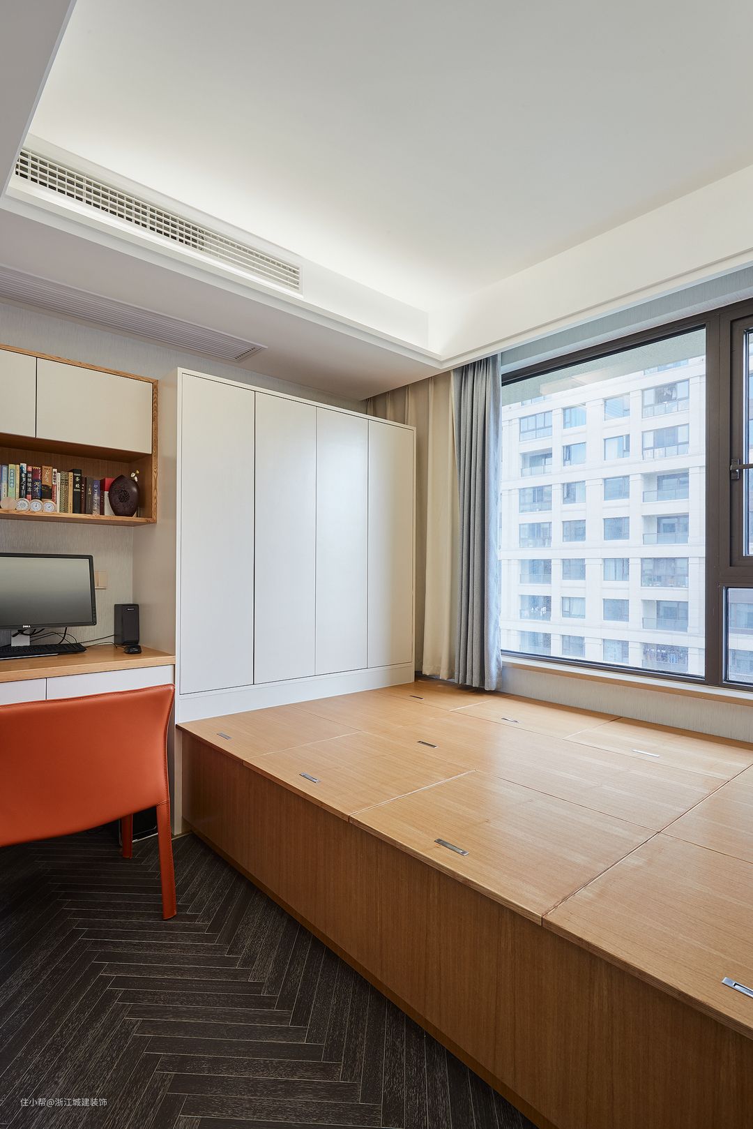 空间内布置了榻榻米,一侧做书桌设计,既是卧室也是书房,还能增加整个家庭的收纳所需。
