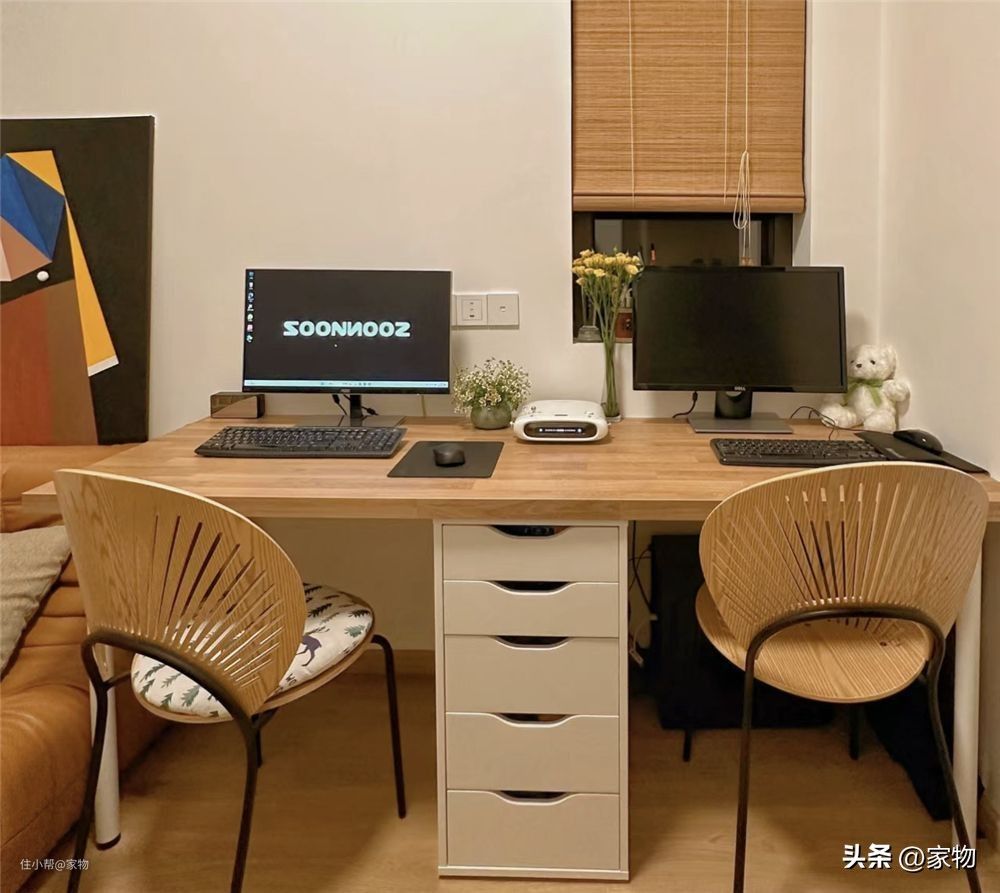 夫妻俩的这张办公桌是双人位的,1.86米的宽度刚好坐下两个人,中间放上一组文件柜,更能收纳更多的文具杂物,让桌面长久保持净空的状态,虽然空间有限,但却非常实用。